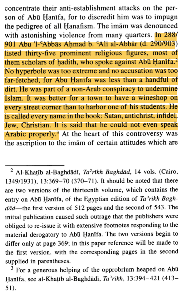 In 1070 al-Khat ̇ı̄ b al-Baghdādı̄ was putting the final touches to his monumental biographical dictionary of over 7,831 scholars who had some connection to the sprawling metropolis of Baghdad. Written in the eleventh century, al-Khat ̇ı̄ b al-Baghdādı̄ ’s magnum opus represented the culmination and vast accumulation of historical information concerning the social and religious history of the eighth–eleventh centuries…Al-Khatı̄b al-Baghdādı̄’s vast collection of hostile reports concerning Abū Hanı̄fa provides an immediate sense of just how widespread discourses of heresy against Abū Hanı̄fa had been before the eleventh century. What it does not allow for, however, is a more precise knowledge of how attitudes to Abū Hanı̄fa changed over the course of the eighth–eleventh centuries; nor does it allow us to reconstruct the proto-Sunni traditionalist textualist community that promulgated discourses of heresy against Abū Hanı̄fa. In short, al-Khatı̄b al-Baghdādı̄ ’s entry on Abū Hanı̄fa is no substitute for a more careful examination, century by century, text by text, and author by author, of the evolution of discourses of heresy. In fact, relying exclusively, or even primarily, on the Tārı̄kh Baghdād risks distorting the history of discourses of heresy and orthodoxy within proto-Sunnism.