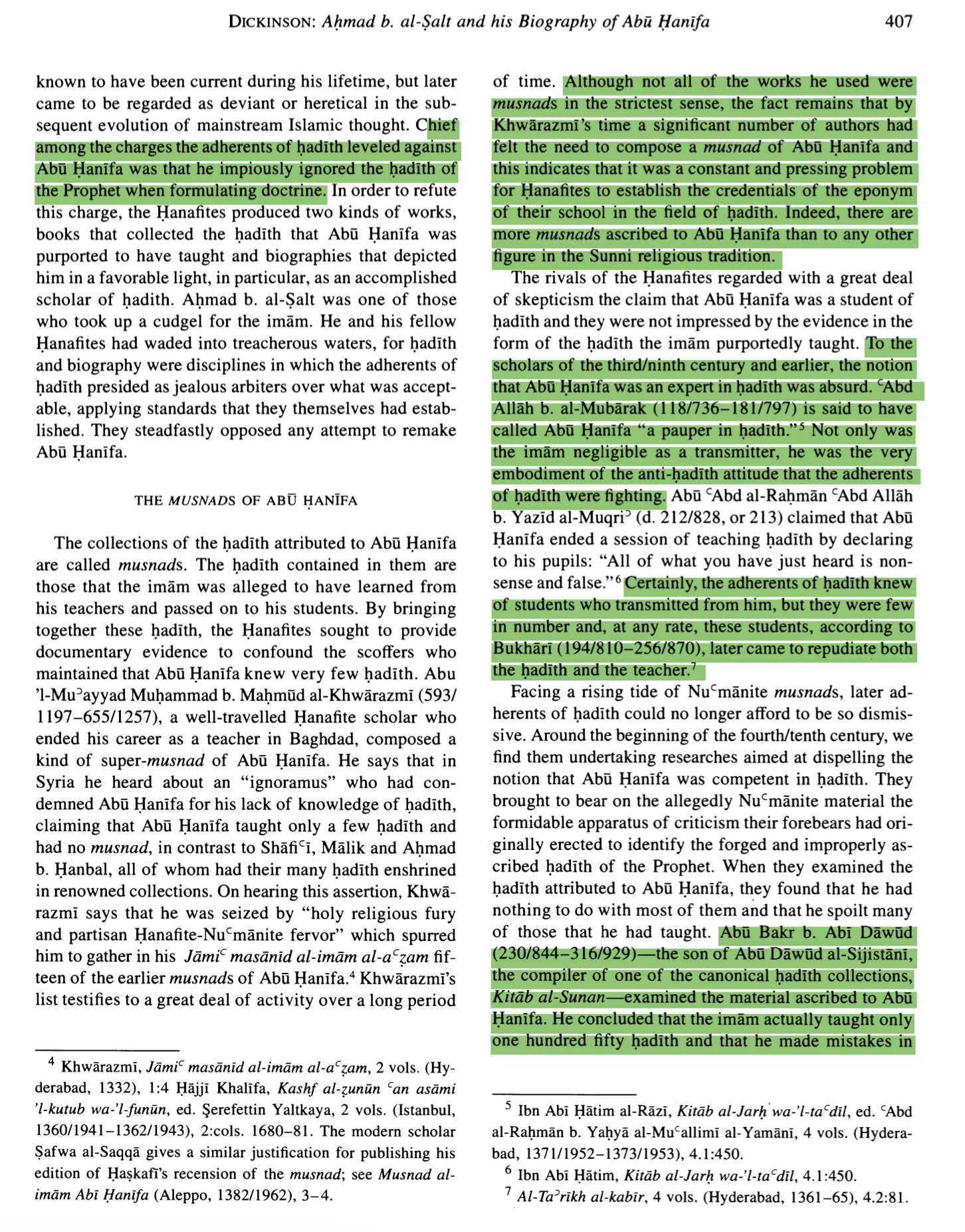 “In the third/ninth century the adherents of hadith attacked Abu Hanifa for his apparent neglect of the hadith of the Prophet Muhammad in the formulation of doctrine. Around the beginning of the fourth/tenth century some Hanafites, including Ahmad b. al-Salt, started to write biographies and musnads which were aimed at establishing the credentials of the eponym of their school in the discipline of hadith. During his own lifetime, Ibn al-Salt was regarded as an unreliable scholar and this view was held by most later authorities. The Hanafites, however, found his representation of Abui Hanifa attractive and sought to preserve it by concealing its connection to him and by trying to salvage his reputation. Although these efforts were not successful, material from Ibn al-Salt continued to appear in the biographies of the imam.”