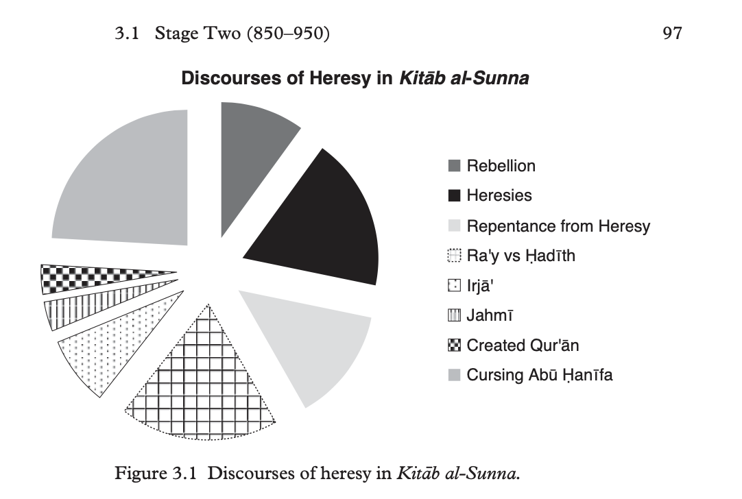 and heretic (zindı̄q) because he believed the Quran to be created;255 students of Mālik b. Anas alleged that he declared Abū Hanı̄fa to be beyond the pale of the religion;256 on a separate occasion, when someone proposed one of Abū Hanı̄fa’s solutions to a legal question, it was dismissed curtly as the view of ‘that apostate’.257 The fourth theme refers to reports that describe Abū Hanı̄fa as having repented publicly from heresy (twenty-three reports). Another prominent theme is rebellion (seventeen reports). ʿAbd Allāh collects reports in which proto-Sunni traditionalists drew attention to the heretical nature of Abū Hanı̄fa’s support for rebellion against Muslim rulers. A sixth theme is Abū Hanı̄fa’s adherence to the heresy of Irjā’ (fourteen reports). Little is made of Abū Hanı̄fa’s views on the Quran (six reports) and his connection to the Jahmiyya (six reports), which is especially surprising given the historical background of the Mihna and the involvement of the author’s father, Ahmad b. Hanbal, in that inquisition. There is no doubt that the Kitāb al-Sunna represented the culmination of proto-Sunni traditionalist attempts to place Abū Hanı̄fa outside the realm of orthodoxy and that the close students of Ahmad b. Hanbal were at the forefront of disseminating discourses of heresy against Abū Hanı̄fa. – p.95-97