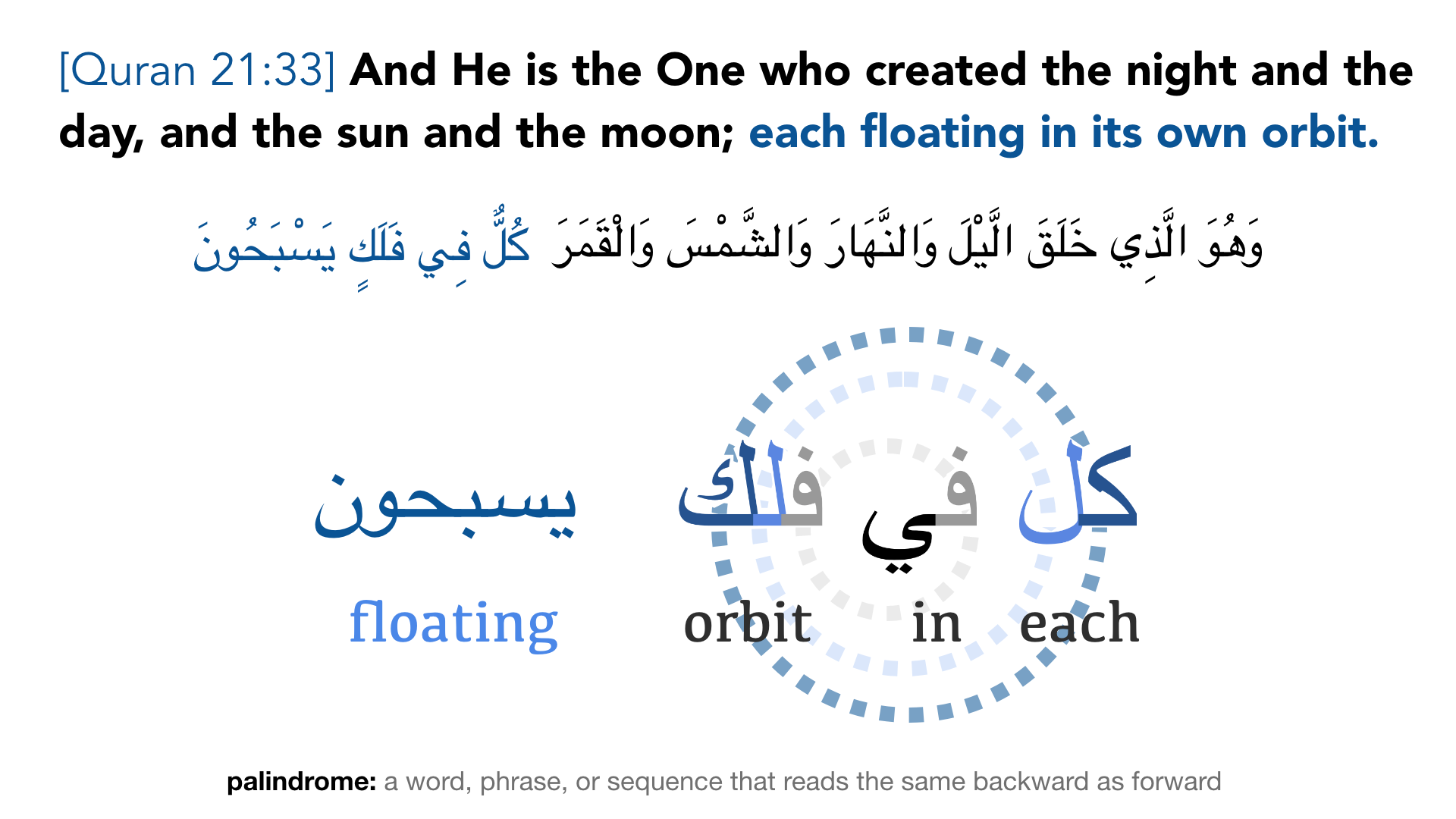 Even the expression “each in orbit” of 21:33 is written as a palindrome, where it can be read forward and backward as if the letters themselves are floating in orbit.