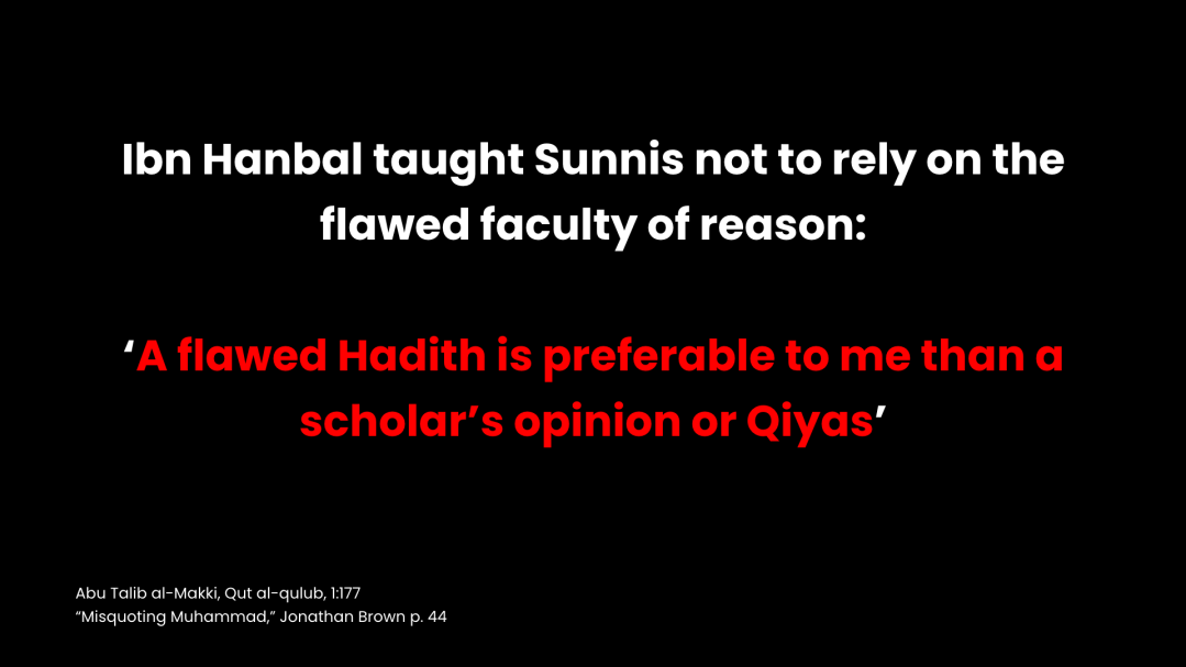 “A flawed Hadith is preferable to me than a scholar’s opinion or Qiyas [analogical reasoning],” …Ibn Hanbal reminded his students, commanded to take their religion from on high and not rely on the flawed faculty of reason.1