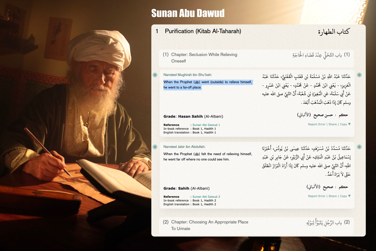 Consider that Abu Dawud, one of the most revered compilers of Hadith, engaged in extensive contemplation to determine the Hadith that would best honor the Prophet for the inaugural chapter of his compilation. After what must have been much introspection and reflection, he ultimately decided to spend the first couple hundred of Hadith discussing how the prophet urinated or defecated.