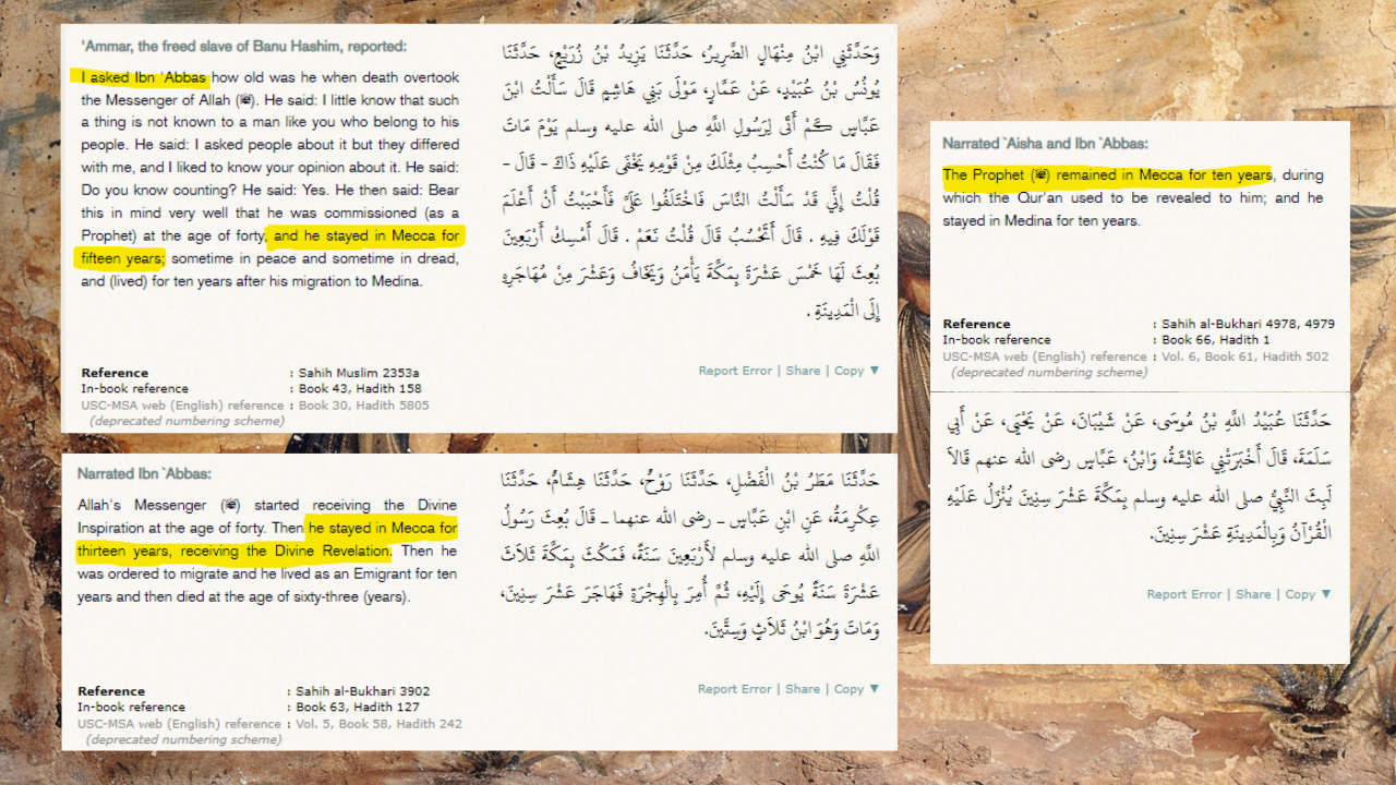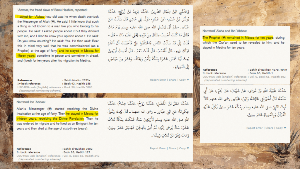 Even the simplest facts in the Hadith are inconsistent. For example, how old was the prophet when he died? Reports from just Bukhari and Muslim state that he was 60, 63, and 65. Some of these conflicting ages are also attributed to the same individual. Or how many years did he live in Mecca after receiving the revelation? Other contradictions are regarding which was the first or last revelations of the Quran. How many wives did the prophet have? What battles did the prophet fight in, and in what order? If the Hadith that are deemed “authentic (sahih)” fail on these most basic facts, how reliable should they be considered for all the multitude of other topics they cover.