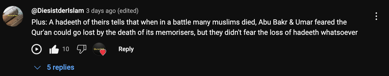 A user on YouTube pointed out an interesting observation in response to a video on why the Islamic state did not attempt to write down, catalog, and preserve the Hadith for the first hundred years after the Prophet’s death.