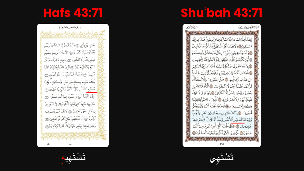 Sura 47:31, the Hafs recitation has the word “tashtahīhi” ( تَشْتَهِيهِ ) while Shuba drops the “hi” ( هِ ) and instead states “tashtahī” ( تَشْتَهِي ).