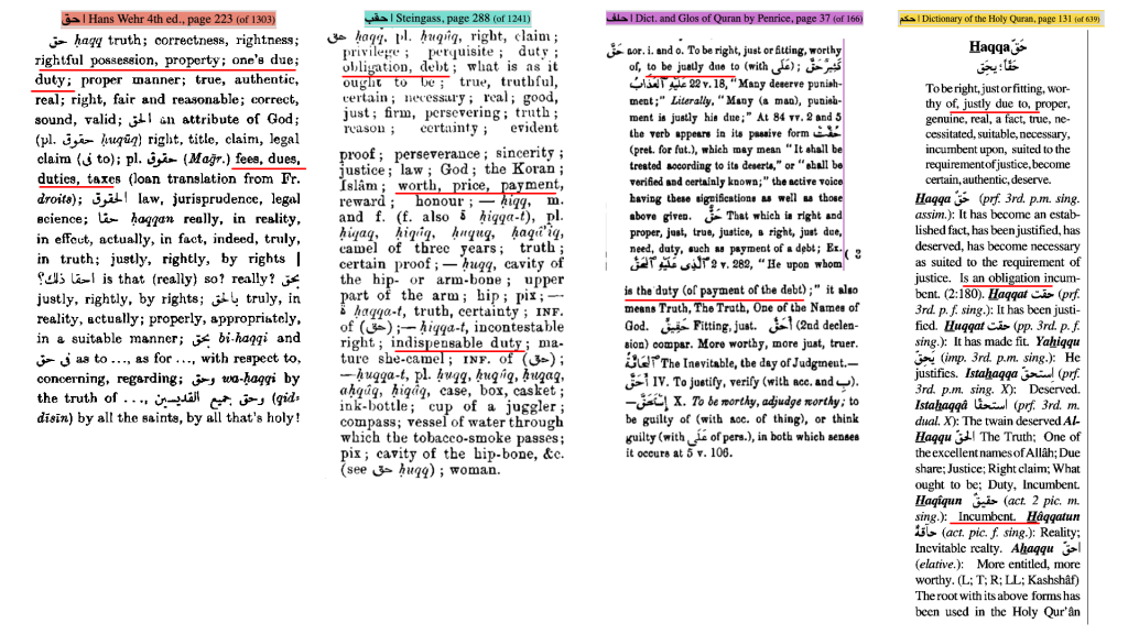 - Dictionary of the Holy Quran: “justly due to,”obligation incumbent.”
