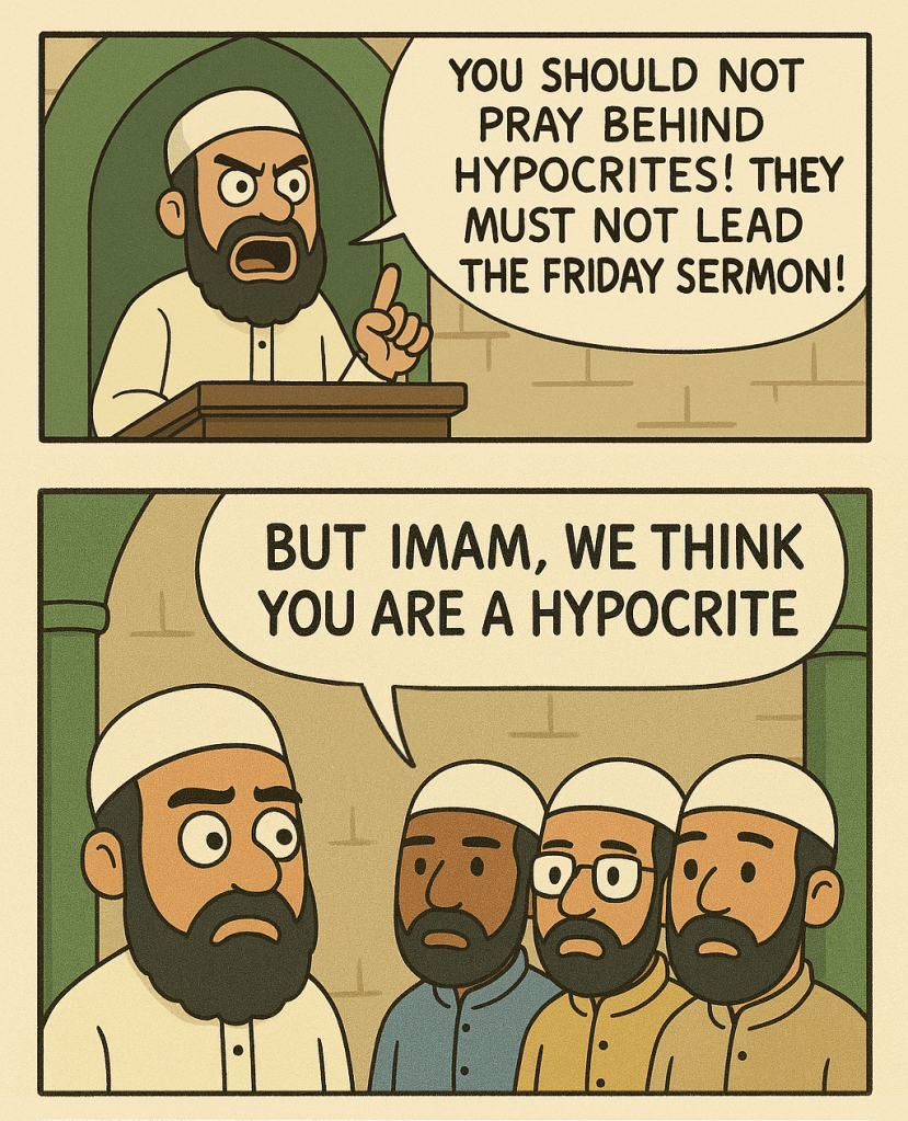 The individual currently fueling this division initially claimed it was prohibited to pray behind hypocrites. When challenged—since identifying a hypocrite is not always clear-cut—they pivoted and escalated, accusing me of promoting prayer behind idol worshipers and disbelievers. These individuals can only gain traction by strawmanning my position, suggesting I would allow disbelievers or random strangers off the street to lead Salat. That’s absurd—and ironically, such a stance would itself be a religious innovation.