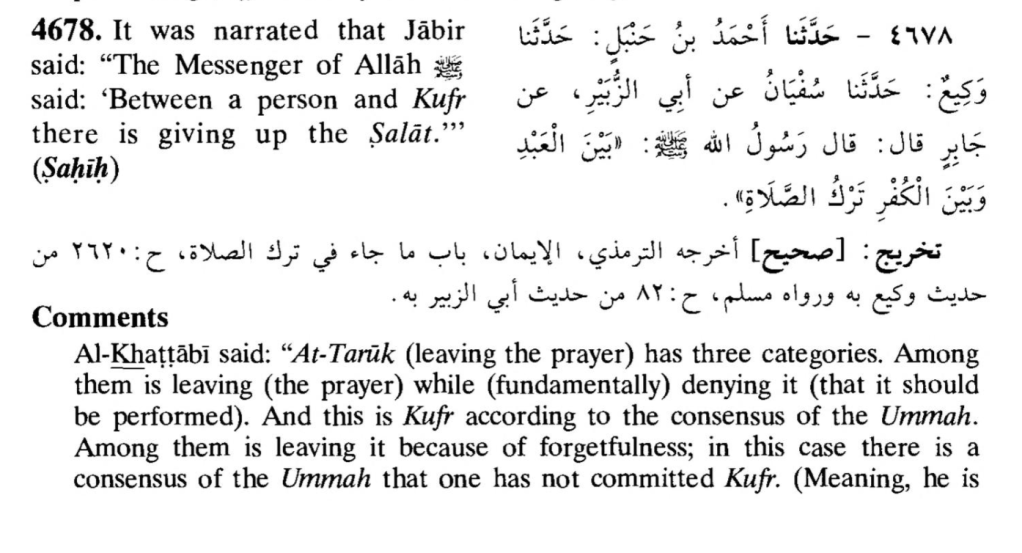 According to this commentary, Al-Khaṭṭābī divided the abandonment of prayer into three categories. The first is leaving prayer while denying its obligation, which he said is unanimously considered disbelief (kufr). The second is leaving prayer out of forgetfulness, and here too there is consensus that the person has not committed disbelief, though he remains obliged to pray once he remembers. The third category—deliberately abandoning prayer without denying its obligation—was the source of major controversy among scholars.