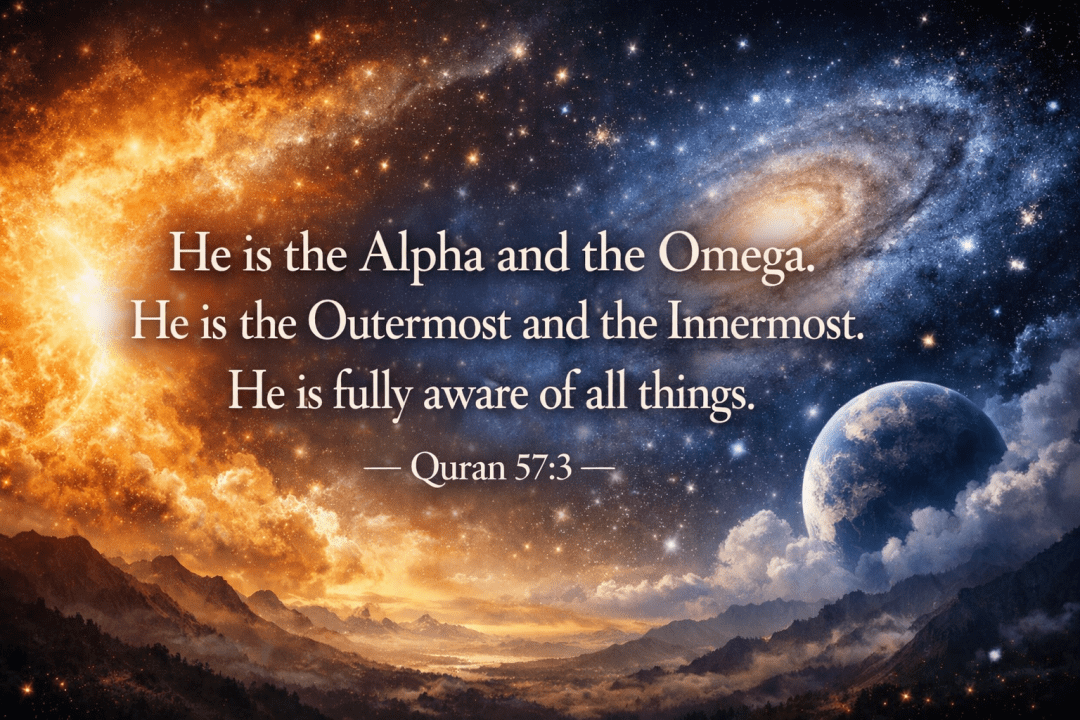 He is the Alpha and the Omega. He is the Outermost and the Innermost. He is fully aware of all things. —Quran 57:3