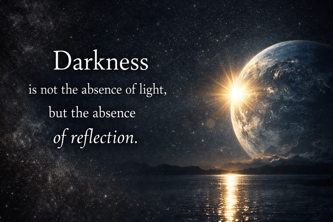 There is a fact about the universe that should unsettle us more than it does. Space—the cosmos in its vast totality—is bathed in light. Photons pour out of billions of stars in every direction, crossing the void in straight lines at the only speed the universe permits. And yet space appears dark. Not because light is absent, but because there is nothing there to receive it, to catch it, to turn it back toward an eye. Therefore, darkness is not the absence of light, but the absence of reflection.